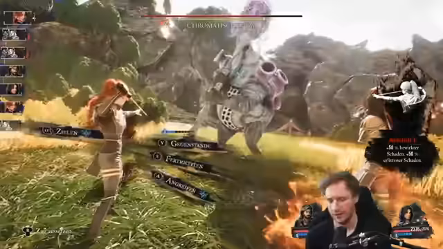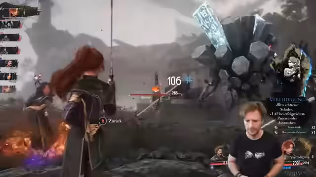 00:10:05Der Streamer erklärt verschiedene Kampfsysteme und Mechaniken des Spiels. Er hebt hervor, wie er seine Waffen verbessert und wie der Schaden steigt. Auch beschreibt er die Bedeutung der Verteidigungshaltung und wie der Bruchschaden verdoppelt wird. Der Streamer diskutiert die Verwendung von Fähigkeiten wie dem Feuereffekt und wie er seine Teamkameraden in den Kämpfen unterstützen kann. Dabei betont er die Wichtigkeit des Timings und des Parierens.