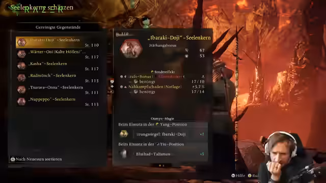 00:30:16Ein Schwerpunkt liegt auf der Verbesserung des Spielstils. Der Streamer entscheidet sich für einen 'full Feuer' Ansatz und experimentiert mit der roten Blume. Er beginnt, eine mystische Technik zu erlernen, die seinen Sprint verbessert und Zugriff auf spezielle Aktionen wie die 'Apokalypse' oder 'Tigerbiss' gibt. Er tauscht auch Waffen aus und versucht, seine Ausrüstung mit violetten Traits zu verbessern.