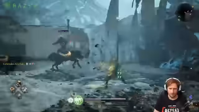 02:13:42Nach mehreren Kämpfen gegen verschiedene Gegner, bei denen er über Ausdauermängel klagt, stellt der Streamer fest, dass manche Gegner, insbesondere Speerträger, unnötig weite Schläge haben. Er beschreibt einen speziellen Gegner, der beim Tod andere Gegner ruft und meint, man könne nur durch Bauen am Boden gewinnen, was er als übel ansieht.