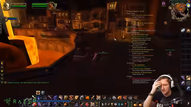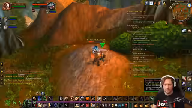 00:13:12Der Streamer und ein Mitquester, ein Paladin namens Acidfire, treffen sich in den Westlichen Pestländern, um quests zu erledigen. Sie konzentrieren sich auf das Gebiet der Rotkammgipfel, kämpfen gegen Gnolle und Spinnen. Der Streamer spielt einen Krieger und hat Schwierigkeiten mit Magie-schadenden Gegnern, da er kaum Resistenzen besitzt. Sie entscheiden, sich gegen gefährlichere Gegnergruppen wie die der Schattenfell-Anhänger zu wenden und stattdessen gezielt kleinere Trupps zu attackieren.