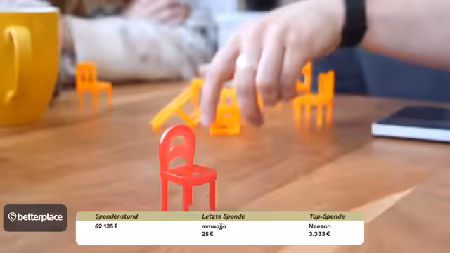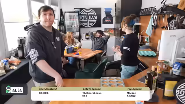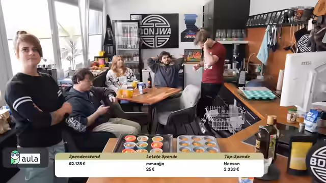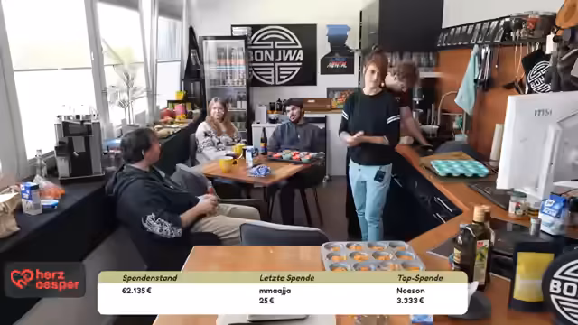 05:10:53Die Spannung steigt, als die Muffins kurz vor dem Ende der Backzeit stehen. Es wird entschieden, einen Muffin zu testen, um zu sehen, ob er schon durch ist, obwohl er noch heiß ist und nicht ganz stabil. Die Gruppe hofft, dass die Muffins bald fertig sind, um sie probieren zu können. Währenddessen wird ein Spenden-Update gegeben, und es wird verkündet, dass bereits 62.160 Euro gesammelt wurden. Es werden zahlreiche Spender namentlich erwähnt und ihnen gedankt. Die Atmosphäre bleibt lebhaft und engagiert, während die Teilnehmer weiterhin versuchen, das Beste aus dem Stuhl-Stapel-Spiel herauszuholen und gleichzeitig die Spendenaktion zu unterstützen.
