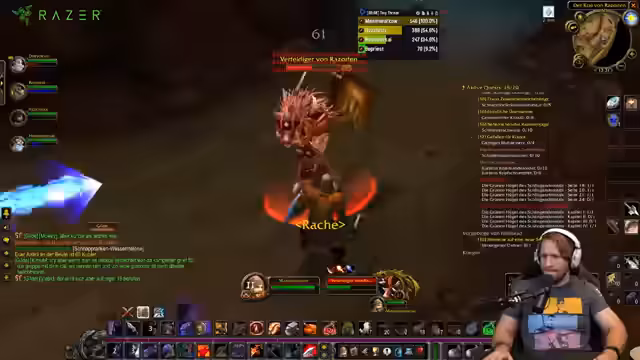 06:01:14Der Streamer unterhält sich mit den Zuschauern und demonstriert sein Gameplay. Gleichzeitig beschreibt er sein real-life Playerlebnis, wie das Bestellen von Sushi während des Streams oder das gelegentliche Blättern in der WoW-App. Dieses ständige Nebeneinander von interaktiven Chats mit den Zuschauern und persönlichen Aktivitäten, oft mit einem humorvollen Unterton, ist ein zentrales Element des Streams und schafft eine einzigartige Atmosphäre.