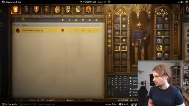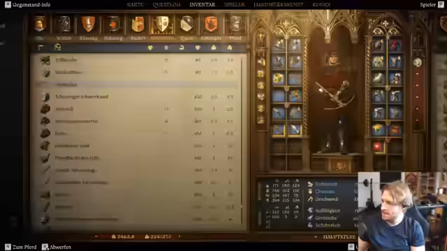 02:35:14Der Stream beginnt mit einer Inventaraufräumungsphase und dem Kauf neuer Ausrüstung. Nachdem gestohlene Rüstung und Waffen den Status 'Gestohlen' verloren haben, werden verschiedene Rüstungsteile wie sächsische Beinplatten, Kettenhandschuhe und Mailänder Beinplatten erworben. Ziel ist es, den Charakter 'tanky' zu machen, während gleichzeitig Inventarplatz durch den Verkauf überflüssiger Gegenstände geschaffen wird. Der Verkauf verläuft anfangs holprig, da die Händler wenig Geld haben, steigert sich aber durch den Tausch von weniger wertvollen Gegenständen.