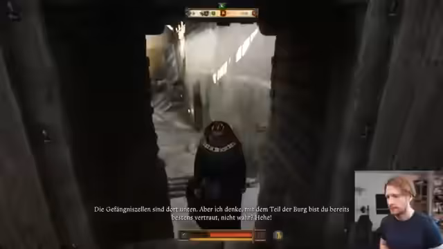 00:06:00Der Streamer beginnt das Spiel, indem er seine Ausrüstung prüft und feststellt, dass er Beinlinge, aber keine Schuhe hat. Er wird beauftragt, Säcke zu schleppen, und beginnt, einer Figur in der Spielwelt zu folgen. Es zeigt sich, dass er sich in der riesigen Festung gut auskennt und seine Wege zielgerannt verfolgt. Die Action beginnt, als er beauftragt wird, eine Glocke zu läuten, was den Start einer Mission markiert.