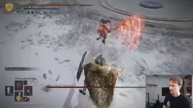 01:35:08Der Streamer bereitet sich auf den Bosskampf gegen Radagon vor und testet dabei eine spezifische Taktik mit der Spektrallanze. Gezielte Angriffe auf den Kopf werden verfolgt, um kritische Treffer zu landen. Während der Kampf als "relativ easy" beschrieben wird, gibt es auch unvorhersehbare Momente, wie verfehlte Attacken und unangenehme, stun-effektive Zauber des Gegners, die die Dynamik beeinflussen.
