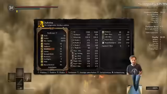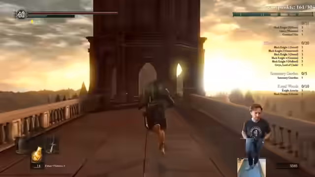 04:19:53Der Damage vom Bogen ist gut. Es wird festgestellt, dass sich unterhalb des aktuellen Standorts Dämon-Titanids befinden. Es wird überlegt, ob man die 20 Flasks machen soll. Es wird beschlossen, nicht in den Keller zu gehen, da es dort zu gefährlich ist. Stattdessen soll Sif getötet werden. Es wird überlegt, wo man runter droppen und die Leiter hochklettern kann. Es wird befürchtet, dass man dort die Titaniten-Agro bekommt. Es wird entschieden, keine Experimente zu machen und stattdessen zu Sif zu gehen. Es wird erwähnt, dass es im Hollow noch Brocken gibt, aber das ist der Super Death. Ash Lake-Geschichten werden für später aufgehoben. Die plus 15 Waffe ist hauptsächlich für die Four Kings gedacht. Es wird erwähnt, dass Dark Souls 2 und 3 gezockt werden, aber das dauert noch ein paar Wochen. Bei Dark Souls 3 wird gehofft, dass es ohne DLC gespielt wird. Ring City wird als insane bezeichnet.