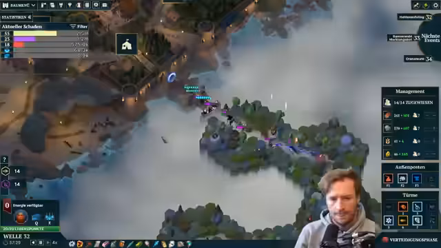 00:31:09Es wird festgestellt, dass die Feuer-Strategie tatsächlich funktioniert und eine effektive Methode ist. Der Fokus liegt darauf, dass die Brandstacks auf den Gegnern bleiben müssen, um Schaden zu verursachen. Außenposten werden gebaut, um die Wirtschaft zu unterstützen, wobei auf die hohen Kosten geachtet werden muss. Es wird eine frühe Fusion von Türmen entdeckt, die das Leveln beschleunigt. Der Streamer forscht an der Quelle des Reichtums und reduziert die Upgrade-Kosten, um das Gold für Forschung auszugeben. Die Steinressourcen werden für den Bau von Mortar-Türmen verwendet. Es wird überlegt, Schwächungstürme zu bauen, um die Gegner zu verlangsamen. Der Streamer strebt danach, das volle Potenzial der Hütte auszuschöpfen und die Bioproduktion zu verbessern, um mehr Geld zu generieren. Die Bedeutung der Schildmechanik der Gegner wird erkannt, und es wird nach Möglichkeiten gesucht, diese zu durchbrechen. Raven-Türme werden gebaut, um Barrieren zu zerstören, wobei der Fokus auf Angriffsgeschwindigkeit und Barriere-Schaden liegt.