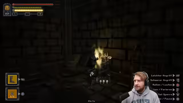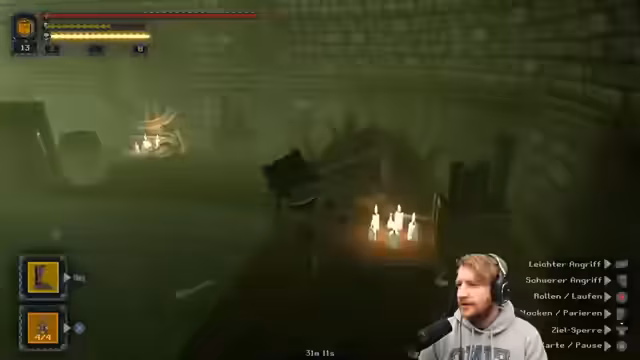 00:13:35Es folgt der Kampf gegen den ersten großen Boss des Spiels, der als unrealistisch, aber spannend beschrieben wird. Das Spiel erfordert ein häufiges Neustarten von vorne. Der Streamer kämpft sich mit viel Ausdauermanagement nach vorne und rollt viel, was eine besondere Fähigkeit namens Königliche Jagd mit Slow-Mo-Effekt auslöst. Er testet verschiedene Waffen und Mechaniken, wie Stichrollen, und entscheidet sich für einen Speerartigen Angriff. Nach dem Sieg beginnt die Erkundung weiterer Bereiche wie Nördliche Höhlen.