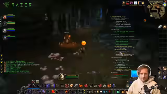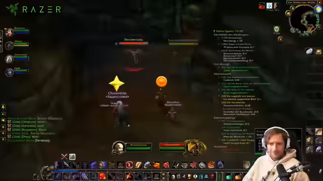 02:59:28Der Streamer plant seine nächsten Quests im Dämmerwald, wobei er eine Chat-Hinweis zur Gefahr auf acht Beinen erwähnt und über die Annahmbarkeit einer Dungeon-Quest aus Ratschett diskutiert. Es findet eine Absprache statt, wer welche Quests teilen kann, und es wird geklärt, dass Maurice die Dungeon-Quest nicht teilen kann, da diese eine Vorquest erfordert. Verena wird als potenzielle Quest-Teilerin vorgeschlagen, da sie wahrscheinlich auf einer anderen Questlinie unterwegs ist.
