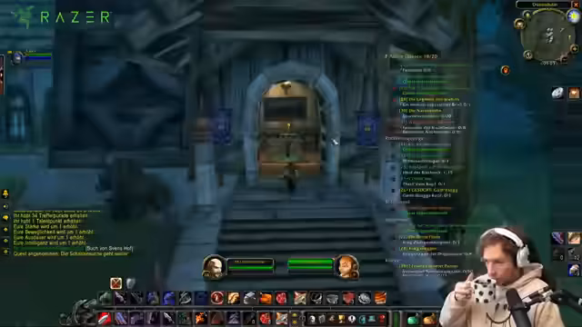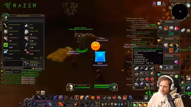 06:45:24Der Streamer präsentiert seine Fortschritte in der Schmiedekunst, die er als 'nicht mehr Kategorie Scheiße' bezeichnet, und bietet seine Fähigkeiten der Gilde an. Er berichtet, dass ihm sehr gute Ausrüstungsgegenstände gelungen sind und er nun Schmiedekunstexperte ist, wobei er aber noch Mondsteine benötigt. Auch der Wochencooldown für den Buff in Stormwind wird erwähnt.