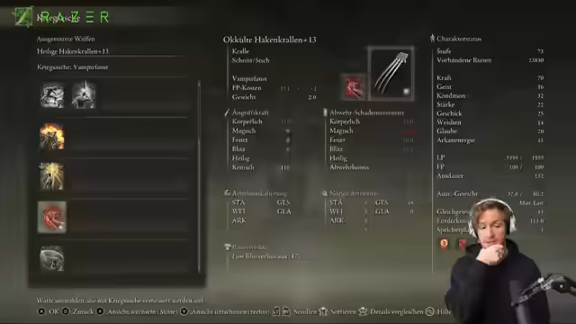 00:07:02Nachdem der WoW-Talk die Zeit füllte, wird zu Elden Ring übergegangen. Die Szene ist eine Kirche von Marika, in der das Suchtverhalten des Streamers deutlich wird. Der Fokus liegt auf der Entdeckung von Waffen und Mechaniken, insbesondere den 'Krallen', die er in 'Night Rain' liebt. Es werden Waffen wie die Eisenkugeln und Eisenbox-Handschuhe als extrem stark gelobt. Der Kampf gegen den 'OP Bärbel Hunter' als Lieblingsgegner wird erwähnt. Gleichzeitig wird die Sucht nach dem Spiel und der Wunsch nach neuen Titeln wie Nioh 3 oder Code Vein 2 geäußert.
