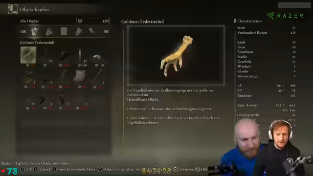 04:53:28Nach dem Bosskampf geht die Reise in eine Handelszone. Der Streamer leitet den Zuschucher durch einen Einkaufsbummel, bei dem essentielle Items gekauft werden. Der Fokus liegt auf dem Kauf einer Rüstung, speziellen Siegeln und dem Speicherstein. Er erklärt die Bedeutung von 'Gleichgewicht' (Equip Load) in dem Spiel und warum es wichtig ist, eine bestimmte Schwelle zu erreichen, um Rollen zu vermeiden und durch Angriffe nicht aus dem Gleichgewicht zu geraten. Er gibt konkrete Anweisungen, wie man die Ausrüstung optimiert, um eine mittlere Last zu halten und gleichzeitig mehr Speicherplätze für Zauber freizuschalten.