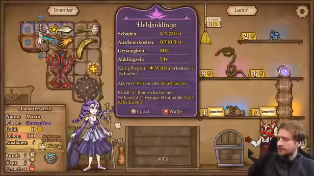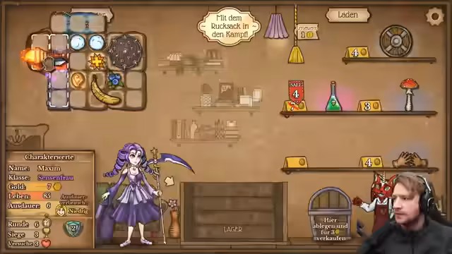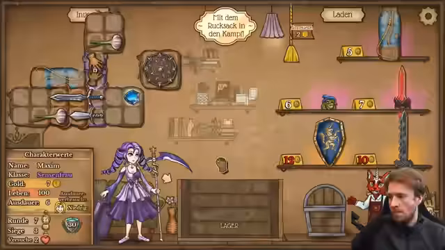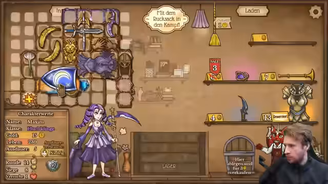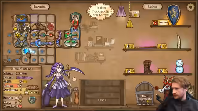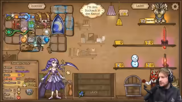00:00:45Zu Beginn des Streams berichtet der Streamer von einem späten Start, da er zunächst seinen Lou in den Kindergarten bringen musste. Er beginnt ein Spiel als Pyromancer, wobei er anmerkt, dass die Feuerschale solide ist, aber aktuell etwas weniger Geld zur Verfügung steht. Sein Ziel ist es, Gegenstände direkt in den Rucksack zu legen und alles Notwendige für den Spielverlauf zu verkaufen, um Ressourcen zu optimieren.