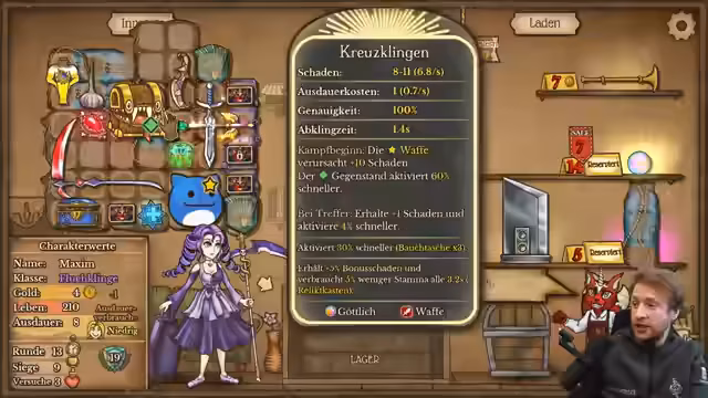 02:56:54Zu Beginn beschäftigt sich der Streamer mit dem aktuellen Spielzustand und kritisiert eine Fehlentscheidung bezüglich eines Dolches. Nach dem Überstehen einer schwierigen Phase plant er nun die effiziente Nutzung seines Inventars und überlegt, welchen Gegenständen er den Vorzug geben soll. Besonders ein Dolch und ein Stein werden als wichtige Optionen für die weitere Strategie diskutiert, wobei er die Vorteile und Kosten abwägt. Die Herausforderungen im Spiel sind offensichtlich, aber er hat genug Platz, um neue Pläne zu schmieden.