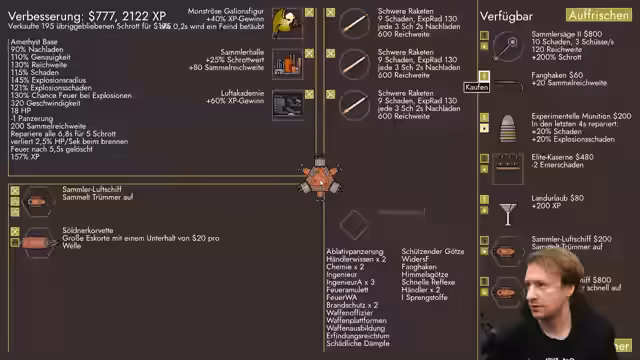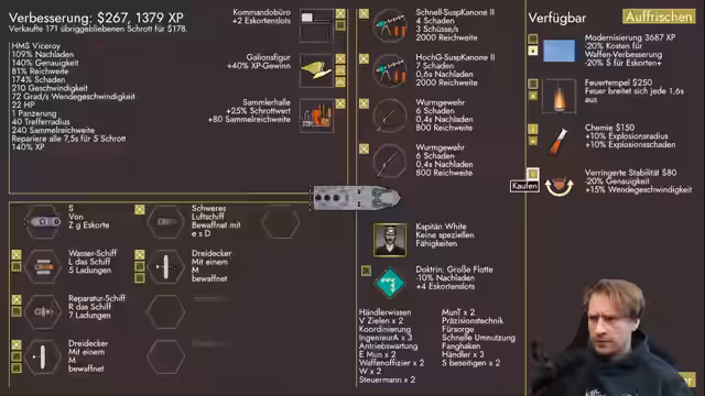 01:25:04Der Streamer analysiert die Spielsituation und stellt fest, dass seine Flotte, obwohl kleiner, für einen Raubzug geeignet war und viel XP brachte. Er hat zwei teure Eskortschiffe erhalten, die aber bisher wenig Nutzen zeigten. Der Fokus liegt auf der Verbesserung der Flotte: Reparaturschiffe werden als entscheidend angesehen, um den Verlust an Leben auszugleichen, und es besteht dringender Bedarf an Geld für Upgrades und neue Schiffe. Experimentelle Munition und eine Koordination mit Plünderern werden als nächste strategische Schritte in Erwägung gezogen.