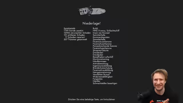 01:14:32Das ursprüngliche Ziel, das Spiel mit dem langsamen, aber stabilen Schlachtschiff zu beenden, wird als fast unmöglich eingestuft. Der Streamer kommt zu dem Schluss, dass das Spiel zwar als 'Kindergarten-Projekt' bezeichnet werden kann, aber dennoch 'geil' ist. Der Wiederspielwert wird durch die vielen freischaltbaren Optionen und den Metaprogess hoch angesetzt, auch wenn es oft wie ein Flash-Game wirkt.