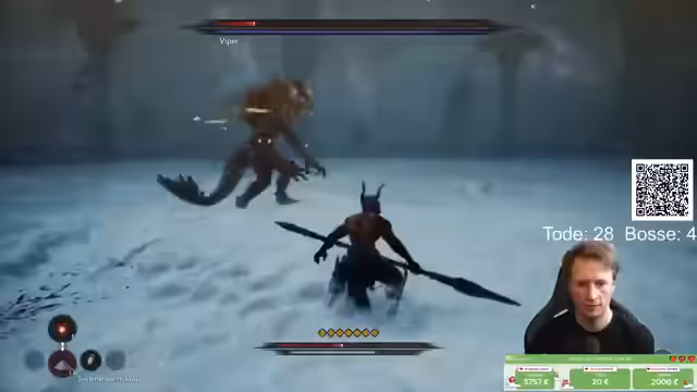 06:27:00Ein harter Bosskampf gegen einen 'Zweihämmer' beginnt, bei dem der Streamer Müsse hat, die komplexen und wiederholten Angriffspausen des Gegners zu antizipieren. Er muss mit seiner Ausdauer sehr haushalten. Eine rote Angriffsfähigkeit des Bosses ist extrem schwer zu erkennen, was den Kampf sehr anspruchsvoll macht. Der Streamer verliert häufig das Leben, da er das rote Symbol für diesen speziellen Angriff nicht rechtzeitig sieht.
