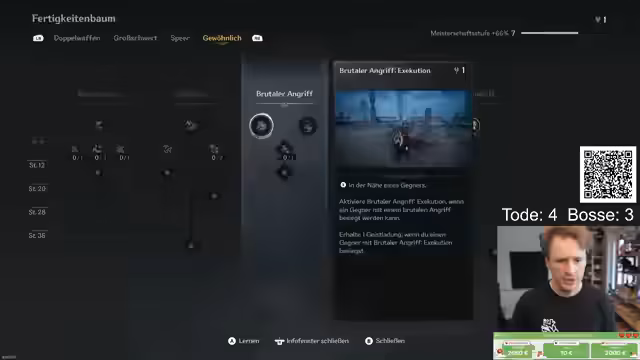 03:00:21Der Streamer konfrontiert sich mit zunehmend schwierigen Gegnern und Bosskämpfen. Er analysiert seine eigenen Fehler und versucht, die Angriffsmuster der Bosse zu erlernen. Ein wiederkehrendes Problem ist der Doppelschlag-Attacke, die ihm immer wieder Ausdauer kostet und zum Tod führt. Er stellt fest, dass sein Build mit viel Ausdauer und Lebenswiederherstellung optimiert ist, aber er sieht, dass er eine aggressive, parry-basierte Spielweise anstrebt. Die Schwierigkeit liegt darin, die timing-sensiblen Angriffe korrekt zu blocken, auszuweichen oder zu parrieren, was seine Nerven und seine Ausdauer auf die Probe stellt.