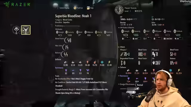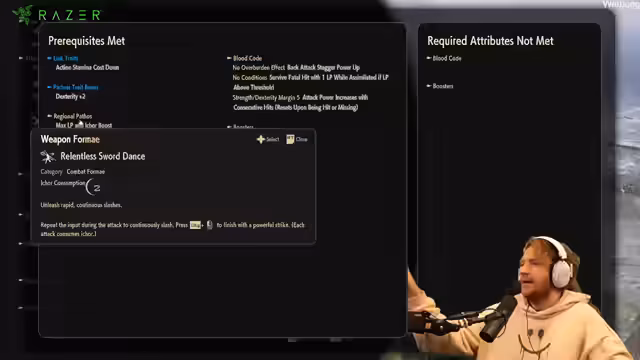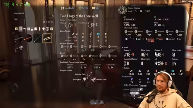03:34:00Nachdem verschiedene Builds verglichen wurden, entscheidet sich der Streamer dafür, auf Teufel komm raus mit einem Speer zu spielen. Der aktuelle Build, der auf 'Blutkot' fokussiert ist, wird für seine Schadens- und Blutungs-Faktoren gelobt. Im Kampf zeigt sich jedoch ein Problem: die langen Animierungen der Angriffe und der Mangel an Hyper-Armor machen es schwierig, Aggro zu ziehen und Schaden zu tanken, was zu unangenehmen Kämpfen führt.