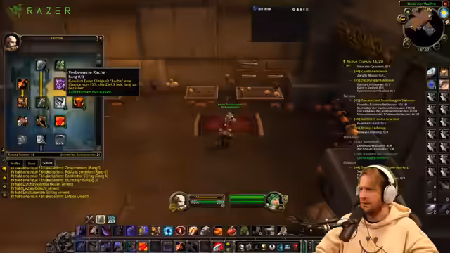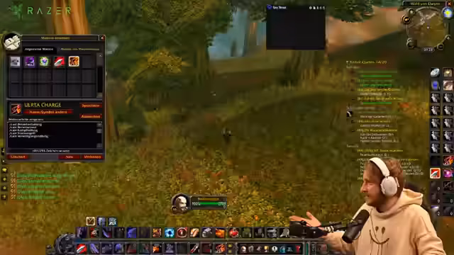 01:53:07Um den Aggro-Build zu optimieren, entwickelt der Streamer ein komplexes Makro, um die Wutgeneration zu maximieren. Er erklärt, dass er durch ein sogenanntes 'Ultracharge-Makro' in die Kampfhaltung wechseln, seinen Supercharge-Spell nutzen und anschließend direkt in die Verteidigungshaltung wechseln möchte, um den Wutbonus zu behalten. Nach anfänglichen technischen Schwierigkeiten und Fehlern, die ihn ärgern, gelingt es ihm, das Makro erfolgreich zu testen. Die Umsetzung führt zu einer signifikanten Steigerung der initialen Bedrohung und erfüllt sein Ziel, den 'saucenesten Tank' zu spielen.
