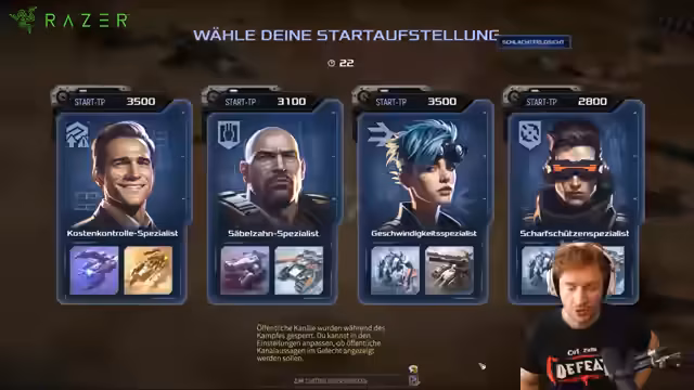 02:51:44Um gegen den Gegner bestehen zu können, wird eine neue Taktik mit 'Sniper Range' entwickelt. Diese soll besonders effektiv gegen Einheiten wie Krabben sein. Der Streamer überlegt, ob ein Überraschungsangriff mit einer extra Einheit sinnvoll ist oder ob sie defensiver spielen sollten. Es geht darum, die Stärken des Gegners zu analysieren und相应的 Gegenmaßnahmen zu ergreifen, um die Oberhand zu gewinnen.