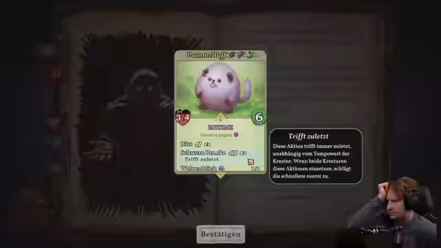 00:02:11Nachdem ein Startgetümmel überstanden wurde, beginnt der Streamer, eine klare Strategie zu verfolgen. Er identifiziert die Fähigkeit 'Todesbiss' als entscheidend und versucht, diese zu erlangen. Es kommt zu einem knappen Kampf, in dem er einen Gegner 'opfern' muss, um eine seiner Kreaturen zu stärken. Die Kreatur 'Tim Gulke' wird als potenzieller Haupt-Tank identifiziert, da sie durch ihre Fähigkeiten 'Droh-Aura' und hohe Lebenspunkte eine starke Verteidigung bieten kann.