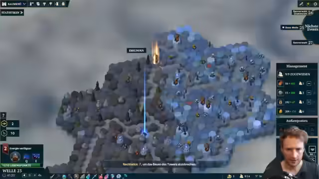 01:59:10Der Fokus verlagert sich zurück auf das Spiel 'Soulkeeper'. Der Streamer plant seine Strategie für das Tower Defense-Genre. Zunächst priorisiert er den Aufbau der wirtschaftlichen Basis, indem er Holz und Gold-Einnahmen maximiert. Die Wahl des Blitzturms als zentrale Verteidigungsanlage wird festgelegt. Entscheidungen über die Reihenfolge des Ausbaus von Türmen, Upgrades und die Produktion von Arbeitern werden live getroffen, um eine möglichst schnelle Wirtschaftskraft aufzubauen.
