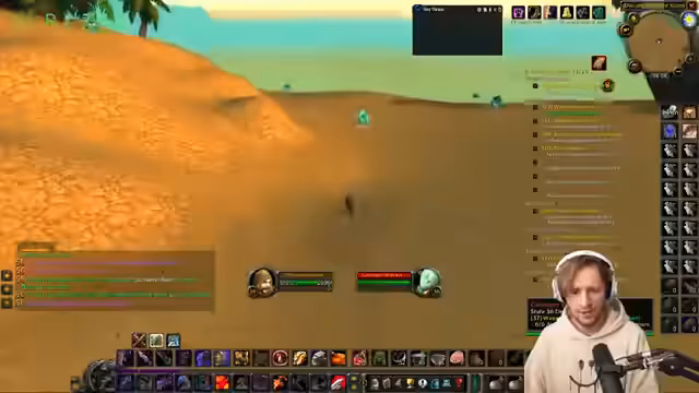 01:40:03Während des Gameplay werden kuriose Situationen gezeigt, bei denen der Streamer versehentlich seinen Tisch mit einem darunter laufenden Laufband umkippt, wodurch Kaffee verschüttet wird. Er fragt sich, warum die Bewohner von Kalimdor so geistig zurückgeblieben erscheinen, und kritisiert das Flugroutennetz der Horde, das als umständlich und ineffizient beschrieben wird. Parallel dazu wird das hohe Lernaufwand für das Bergbau-Handwerk thematisiert.