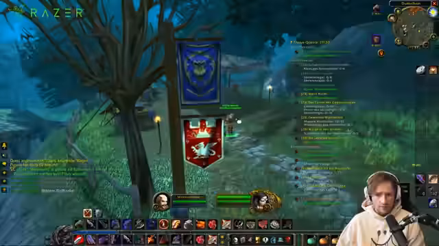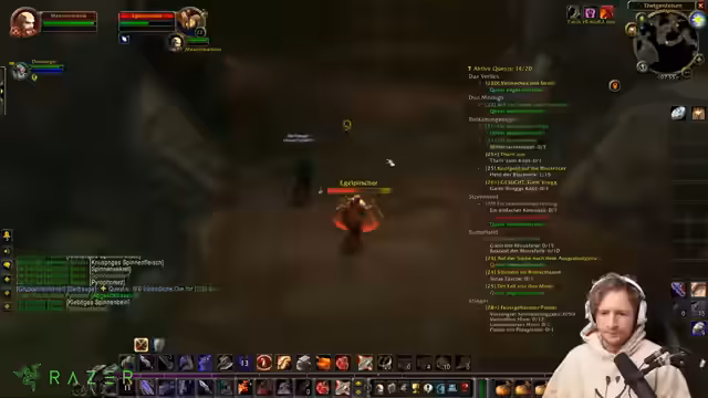 02:43:01Nachdem die Gruppe das gefährliche Tor sicher passiert hat, ist sie nun im Gebiet Ashenvale. Der Streamer unterhält sich mit dem Chat über die Gefahren von Griefern und dem PvP-System im Spiel. Er wird aufgeklärt, dass man jederzeit von Spielern der gegnerischen Fraktion angegriffen werden kann, auch wenn es in bestimmten Gebieten wie Ashenvale riskanter ist. Der Streamer lernt, wie er das PvP-Flaggen aktiviert, und fürchtet, aus Versehen auf einen gegnerischen Spieler zu klicken und damit selbst angreifbar zu werden. Er warnt auch davor, seinen Ruhestein in feindlichen Städten zu binden, da er sonst sofort von Wachen angegriffen würde.