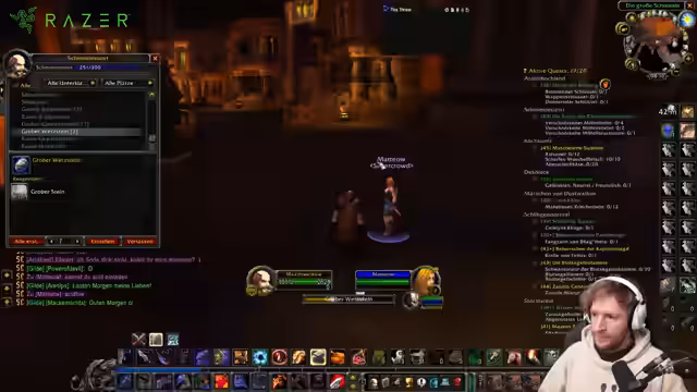 00:00:32Der Stream beginnt mit einem kurzen Morgen-Stream, da die anderen noch schlafen. Der Fokus liegt auf dem Schmieden, wobei ein unerwarteter Mangel an Magiestoff für geplante Projekte den Tagesablauf stört. Da die Banken leer sind, werden Möglichkeiten erkundet, die fehlenden Ressourcen von Tristan zu beschaffen, oder es werden alternative Ziele wie ein Besuch in Tanaris in Betracht gezogen, um Materialien zu farmen.