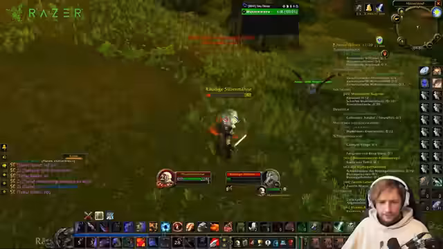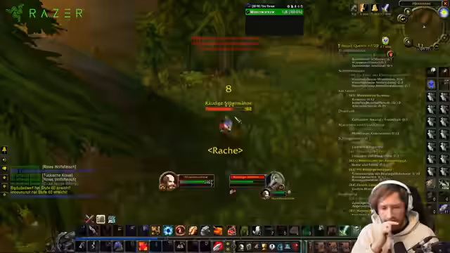 01:45:31Nach einer kurzen Pause wegen technischer Unannehmlichkeiten setzt der Streamer das Waffenleveln fort. Er wundert sich über den Sprachwechsel im Spieltext, bleibt aber bei seinen Aufgaben. Der Fokus liegt auf dem Leveln einer neuen Waffe, dem Bierkug, während er erklärt, dass er sich eigentlich auf das Jagen von Eulenbären konzentrieren wollte. Ein Vorteil des Spielorts ist die lange Respawnzeit, die im Falle eines Disconnects mehr Sicherheit bietet. In Dungeons fühlt er sich als Tank aufgrund seiner ungewöhnlich hohen Verteidigungswertung und Fähigkeiten wie 'Rüstung zerreißen' praktisch unklinglich, was ihm und seinen Gruppenmitgliedern Sicherheit gibt, auch wenn sie dadurch etwas langsamer agieren.