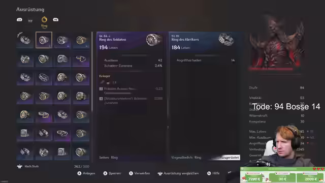00:00:01Der Stream startet mit einem Lockruf an die Zuschauer. Der Streamer befindet sich in Berlin und hat keine Verpflichtungen, was zu einem frühen Start führt. Nach einer Dusche fährt er los und beginnt direkt mit dem Gameplay. Er erwähnt, dass er den Boss von gestern bereits besiegte und dabei ein neues Rüstungsset erhielt. Da er das Craften als schlechten Content empfindet, testet er dennoch die Attribute des gefallenen Wächters und stellt fest, dass der Schaden "stupid" ist.
