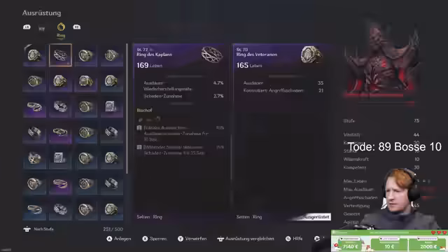 00:17:12Nach einem erfolgreichen Bosskampf widmet sich der Streamer mehr den Seitenaufgaben und der Verbesserung seines Charakters. Er hat viele Fertigkeitspunkte gesammelt und entdeckt neue Fähigkeiten. Ein Fokus liegt auf dem Sammeln und Craften verschiedener Rüstungs-Sets wie des Vernichters, des Tiefschattens und des gefallenen Herrschers. Jedes Set bietet einzigartige Boni, die je nach Boss oder Situation Vorteile bringen können. Besonders begehrt ist ein geiler Speer.