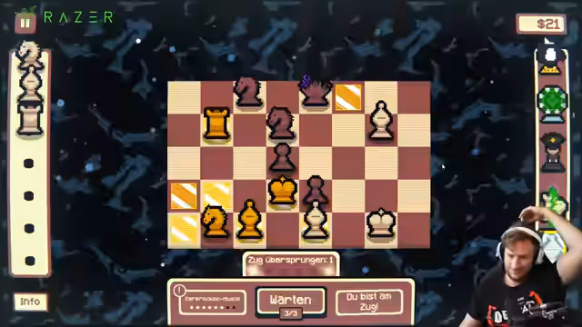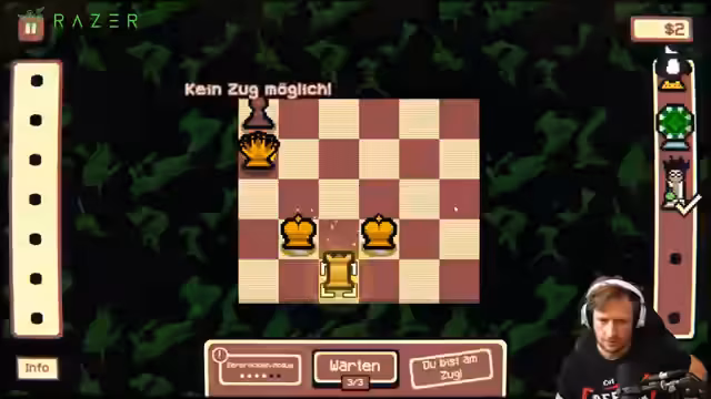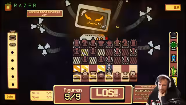 02:21:39In Gambonanza, einem Schach-basierten Roguelike, geht der Streamer riskante Züge ein, um Geld zu verdienen. Er nutzt spezielle Gambits wie die Rochade, die gegnerische Züge canceln kann, was er als übermächtig (OP) betrachtet. Das Spiel wird als extrem RNG-basiert beschrieben, was den Streamer frustriert. Trotz strategischer Vorbereitung durchkämpft er sich durch die Runden, hofft aber auf gute Zufallsereignisse wie das Stunnen gegnerischer Figuren.