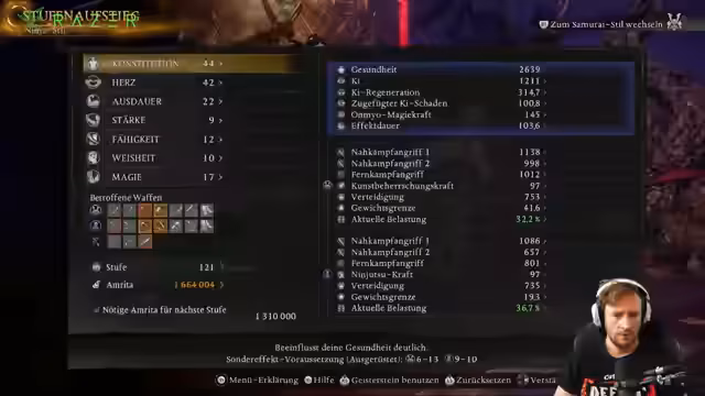 00:06:03Es wird klar, dass der Streamer bereits fortgeschritten ist und bei Level 170 auf NHP (New Game Plus Plus) spielt, was für einen One-Shot bedeutet. Die Streams finden nur in kurzen Sessions von 2-3 Stunden statt. Der Streamer vergleicht dies mit WoW, wo er 40 Tage lang täglich 5 Stunden spielte, und betont, dass er mehr Nioh als WoW spielt. Er stellt fest, dass die Gegner schneller und aggressiver sind, aber gleichzeitig weniger Schaden verursachen, was das Spiel anpassungsbedürftig macht.