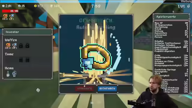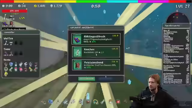 01:04:20Das Gameplay wird fortgesetzt, wobei der Streamer die zweite Welt des Spiels erreicht. Er setzt seine Erkundung fort, wobei er sich auf das Sammeln von Upgrades und das Besiegen von Bossen konzentriert. Der Streamer experimentiert mit verschiedenen Gegenständen und Waffen, darunter eine Atombombe und eine "Goldenpiste". Er passt seine Strategie an und versucht, Dodge zu stacken, um eine hohe Ausweichchance zu erreichen. Trotz einiger Schwierigkeiten und unerwarteter Tode bleibt er am Ball und versucht, das Spiel zu meistern. Er kommentiert humorvoll seine Missgeschicke und die bizarren Elemente des Spiels. Der Streamer interagiert weiterhin mit den Zuschauern und berücksichtigt ihre Vorschläge bei der Wahl seiner Strategie. Er äußert den Wunsch, die Musik des Spiels hören zu können, da er vermutet, dass sie sehr cool ist.