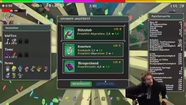 05:40:35Es wird überlegt, was gegessen werden soll, wobei Optionen wie Kokos, Sushi, Burger und Ramen zur Auswahl stehen. Ein Ramenladen in Leipzig wird erwähnt. Im Spiel wird festgestellt, dass Größe maximiert wurde und nun Schaden benötigt wird. Rüstung und Dornen werden als weniger wichtig erachtet, während der Spiegel als potenziell nützlich angesehen wird. Der Gigachat wird als verstanden betrachtet, und es wird die Frage nach dem Maximallevel für Waffen aufgeworfen. Es wird überlegt, ob die Chonkers außen vor gelassen werden sollen. Der Streamer fragt nach dem Maximallevel für eine Waffe und äußert sich zufrieden über das Spielgefühl. Es wird diskutiert, ob Tech Speed erhöht werden muss, und es wird ein Mankey im Chat erwähnt. Ein Burger wird versehentlich gegen einen anderen eingetauscht, und es wird festgestellt, dass die Mikrowelle Items verdoppelt. Ein benötigter Ring wird gefunden, und es wird betont, dass mehr HP benötigt wird. Der Schwarm wird als positiv angesehen, und es wird nach dem Klonen gefragt.