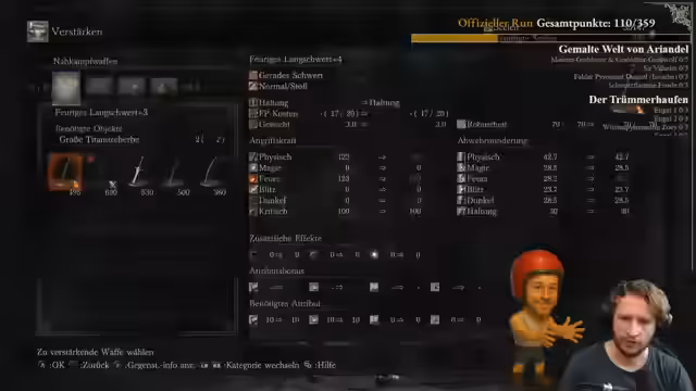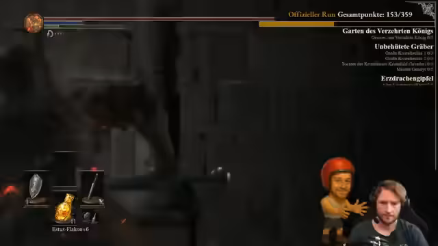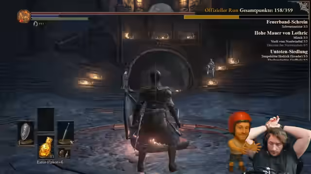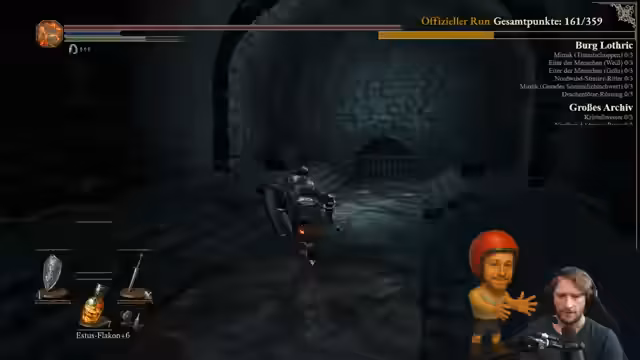 04:01:10Der Streamer kämpft gegen eine Spinne und Gegner im Irithyll-Verlies. Der Kampf als geplantes 1-gegen-1 gestaltet sich schwierig, da er bereits für einen früheren Fehler bestraft wurde und eine Wiederholung nicht gewünscht ist. Während des Kampfes wird jedoch ein unerwarteter Fund gemacht: eine Scherbe für einen Estus-Flakon, die der Streamer nach über 300 Spielstunden noch nie gesehen hatte, was als 'illegal gutes' Erlebnis bezeichnet wird.