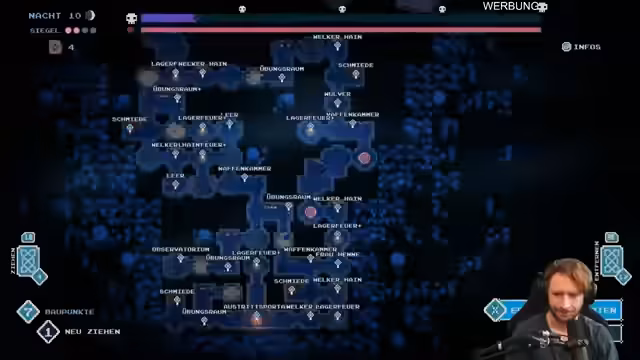 00:05:15Der Streamer beginnt mit dem Spiel !SOULKEEPERS RUN. Er beschreibt den ersten Bossgegner Wollnir als unangenehm und löst ein Rätsel. Er erklärt die grundlegende Spielmechanik: Ruinen werden durch das Ausspielen von Karten auf Gittern erweitert. Jede Karte kostet Baupunkte und wird danach in den Ablagestapel gelegt. Die Fackel des Spielers hat begrenzte Brenndauer, was Zeitdruck erzeugt. Gegner können getötet und Glimmer geerntet werden, um neue Ruinenteile freizuschalten.