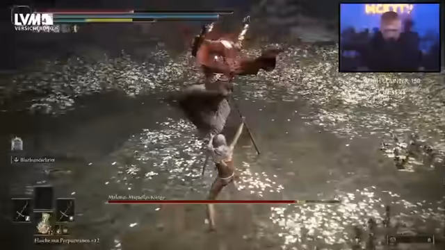 00:32:58Der Stream beginnt mit dem Kampf gegen die Hardcore-Version von Malenia. Der Streamer muss sich mit veränderten Angriffsmustern und erhöhter Schwierigkeit auseinandersetzen, die den Kampf deutlich erschweren. Die vierphasige Herausforderung erfordert maximale Konzentration und schnelle Reaktionen des Streamers, der seine Strategien immer wieder anpassen muss.