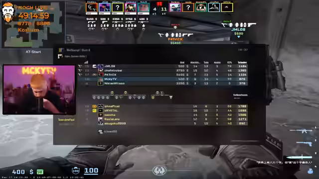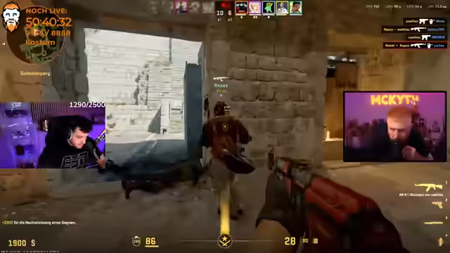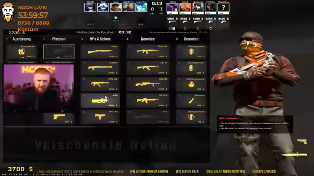 10:31:48Nach einer verlorenen Runde werden die Taktiken angepasst. Der Streamer bemängelt, dass das Team zu langsam agiert und die Calls nicht konsequent umsetzt. Es kommt zu einem kritischen Moment, als wichtige Granaten wie Smoke und Flash im Kaufmenü verschwinden. Der Streamer ist verärgert und sucht nach einer Erklärung für dieses Problem, das das Spiel gefährdet.