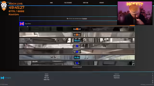 09:20:25Ein Spieler namens Medi fällt im Spiel aus, was den weiteren Verlauf des Matches beeinflusst. Dies führt zu einer leichten Pause. Ein Kartenwechsel erfolgt, und das Team spielt nun auf einer neuen Karte gegen Team 'Ohne'. Es wird eine taktische Änderung diskutiert, wie man das neue Gegenüber am besten bekämpfen kann, und die Stärken des neuen Gegners werden analysiert.