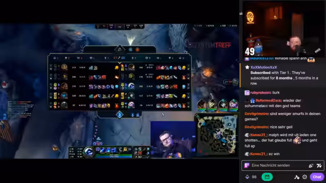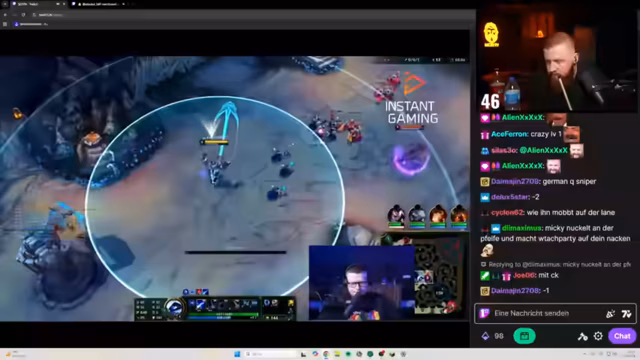 06:30:50Raid von 'Uwe Reinholzen' wird gefeiert; neues Publikum wird begrüßt. Sane gewinnt mehrere League-Spiele, was den Streamer frustriert ('ich bin gebrochen'), besonders bei Wachstums-Chancen für Sane. Hype-Train-Interaktion mit Sub/Resub-Aufforderungen und Chat-Aktivität (Einsen im Chat). Es folgt ein Champion-Wunsch für Sane (Jungle Kiana vorgeschlagen). Danksagung an Subs/Resubs, Zusammenfassung des 'treuen' Streams. Beendigung mit Hinweis auf Schlaf und Verdauung nach langem Stream (über 12 Stunden).