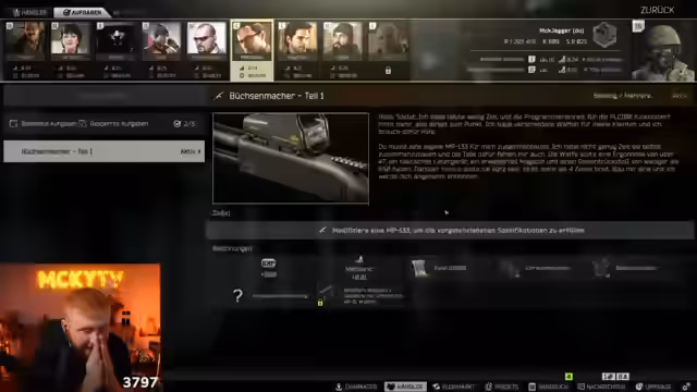 01:36:37Der Streamer setzt seine Ausrüstungsplanung fort, indem er Griffe und andere Modifikationen für seine Waffen kauft. Er versucht, seinen Level bei Ragman zu erhöhen, um bessere Ausrüstung kaufen zu können. Er spricht über verschiedene Quests und welche er als Nächstes angehen soll, darunter das Finden einer Morphin-Spritze und das Platzieren von Bisonverse Undertaker Plakaten in Woods. Er überlegt, ob er auf Ground Zero gehen soll, um Anfangsdinge für die Quests zu finden. Er diskutiert mit dem Chat darüber, ob er sich auf Mainquests oder Eventquests konzentrieren soll. Er spricht über das Craften von Gegenständen in der Station und die dafür benötigten Materialien. Er kauft Ausrüstung und Munition, um seine Waffen zu modifizieren und Quests abzuschließen.
