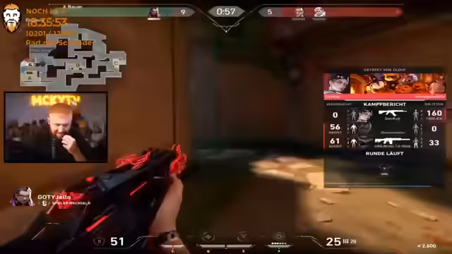 09:04:59Nach einer turbulenten Runde blicken die Streamer auf das Gesamtmatch zurück. Obwohl sie einige Runden gewonnen haben, summiert sich der Punktverlust und sie beenden das Spiel mit einem negativen Ergebnis. Der Streamer bewertet seine eigene Leistung als eher schlecht, gibt aber auch zu, dass das Gegnerteam gut zusammengearbeitet hat und einen klaren Vorteil hatte. Ein Teamkollege wird für seine 'Jutls', also seine strategischen Fähigkeiten, gelobt, während der Aim als nicht ausreichend eingestuft wird. Es folgt ein allgemeiner Plauderei über das Match und eine Verabschiedung des Stream-Teams von der Community.