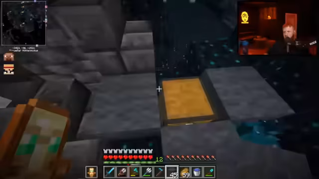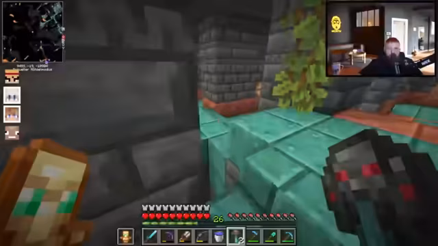 10:20:00Nach der Ankunft in der unterirdischen Ancient City wird eine komplexe Sicherheitsanlage erklärt: Blaue Sensoren und vier Spitzen bilden eine Alarmanlage, die bei Lärm einen Boss spawnen kann. Der Streamer und sein Partner bewegen sich geduckt, um Geräusche zu vermeiden, und sammeln mit Scheren vorsichtig graue Wolle. Während der Erkundung werden Kisten geöffnet, die teilweise Schrott, aber auch wertvolle Gegenstände wie Diamanten, verzauberte Bücher und Tränke der Regeneration enthalten. Ein Totem in Form eines Kekses wird als Backup erwähnt.