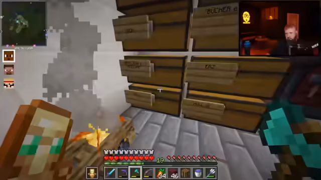 00:05:00Fokus liegt auf der Organisation von Farmen und Villagern. Der Streamer zeigt die neu eingerichtete Lagerstruktur mit Kisten für Holz, Nether-Stein, Büchern, Werkzeugen etc. und betont die Wichtigkeit von Ordnung. Es folgt eine Diskussion mit G-Time und Micky über die Einrichtung von Handels-Villagern (speziell Dreifach-Armbrust-Typen). Der Streamer planen, sich auf zwei bis drei Farmen zu konzentrieren und fordert mehr Villager für effizienteren Handel.