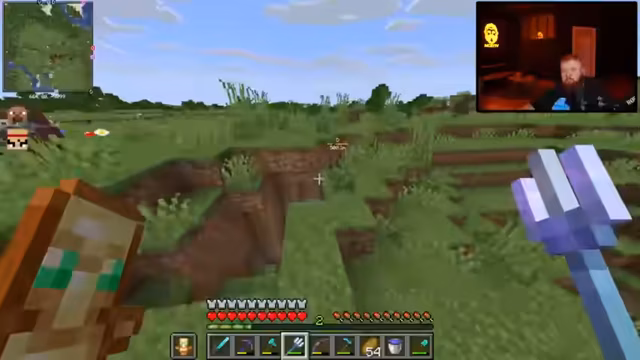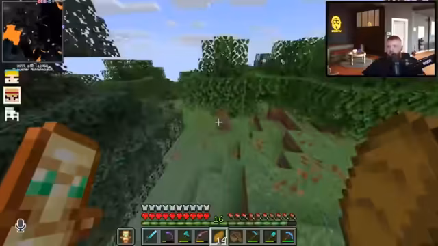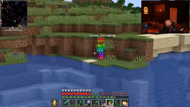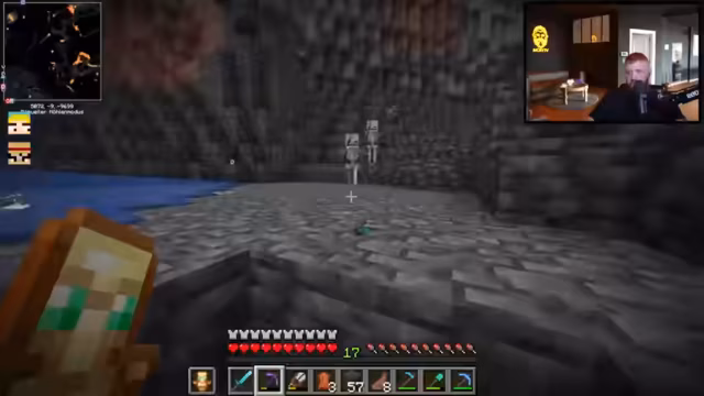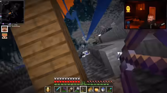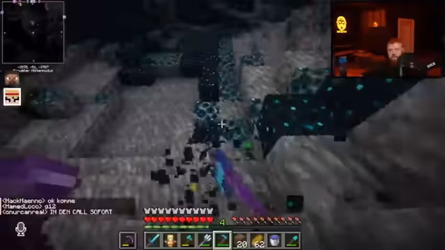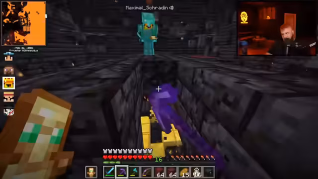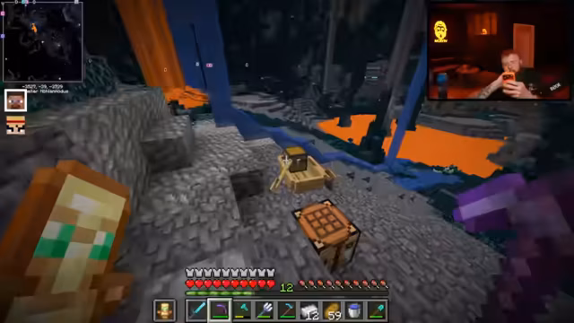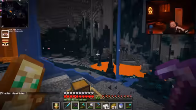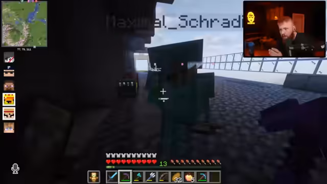 12:00:47Nach dem Betreten des Nethers warnt der Streamer vor der überall präsenten Lava. Das Team überlebt nahe Lava-Fallen durch Essen und zeigt Kampftechniken wie gezieltes Schlagen gegen Schweine. Schradin wird die korrekte Sprungtechnik (STRG statt Shift) erklärt. Später entdecken sie Quarz und diskutieren die Suche nach der Netherite-Vorlage für die Rüstung.