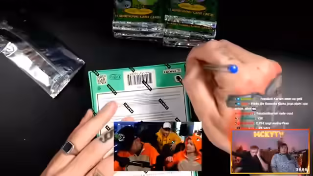 03:03:39Der Stream konzentriert sich auf das Öffnen von Boosterpacks im Stil eines 'Watchpartys'. Die Teilnehmer verfolgen live die Quote der gezogenen Holo-Karten und spendieren sich gegenseitig Packs. Die Erwartungen sind hoch, und jede gezogene Karte wird live kommentiert, begleitet von Ausrufen der Anspannung und Freude oder Enttäuschung.