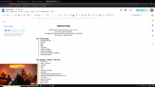 07:35:48Der Streamer gibt einen detaillierten Einblick in die Planung des anstehenden 'Naschiton', eines 100-tägigen Marathons. Die Challenge-Regeln werden erklärt, bei denen pro Subscriber die Stream-Zeit verlängert wird und spezifische Spiele-Kategorien am Rad gedreht werden. Es werden mehrere Meilensteine und Strafen für den Streamer genannt, darunter ein PC-Giveaway, ein 24-Stunden-Stream und im Fall eines Scheiterns der Verzicht auf Bart und Haare sowie ein Tattoo.